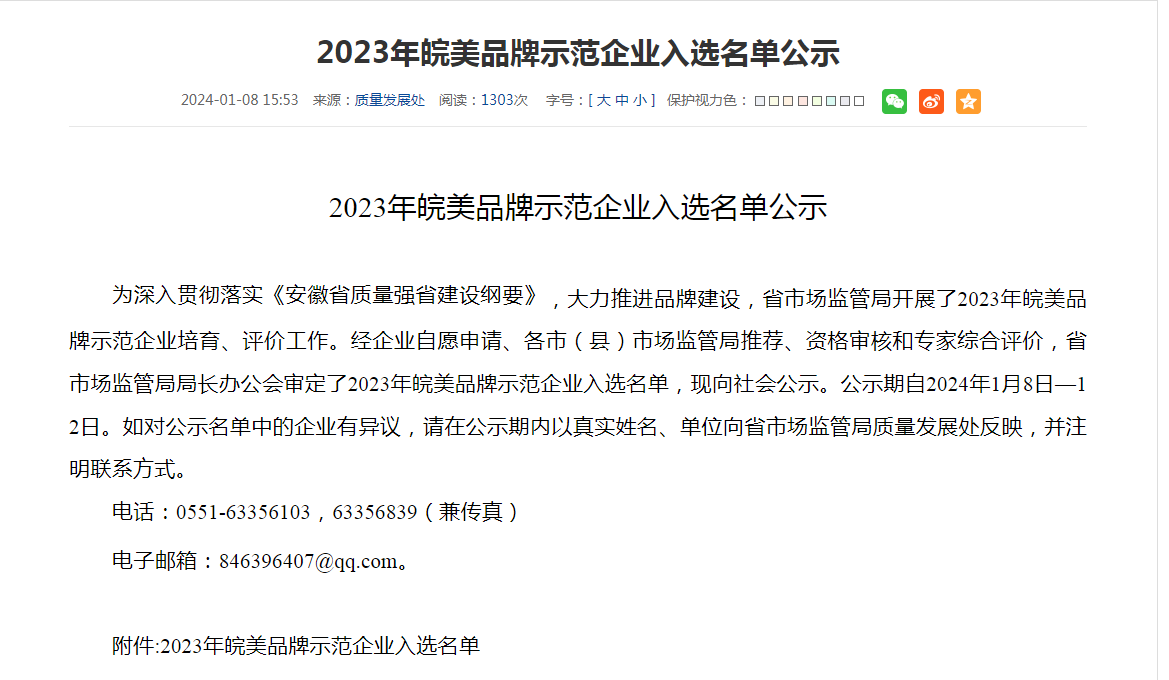 公司榮獲“2023年安徽皖美品牌示范企業(yè)”